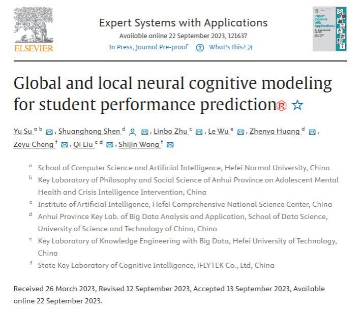 相关成果以“Global and Local Neural Cognitive Modeling for Student Performance Prediction”为题发表在计算机科学大类分区一区期刊Expert Systems with Applications上。该刊为中国科学院大类一区TOP期刊,影响因子为8.665。太阳成集团tyc122cc入口为论文的第一单位,青少年心理健康与危机智能干预安徽省哲学社会科学重点实验室、计算机与人工智能学院苏喻老师为论文第一作者。