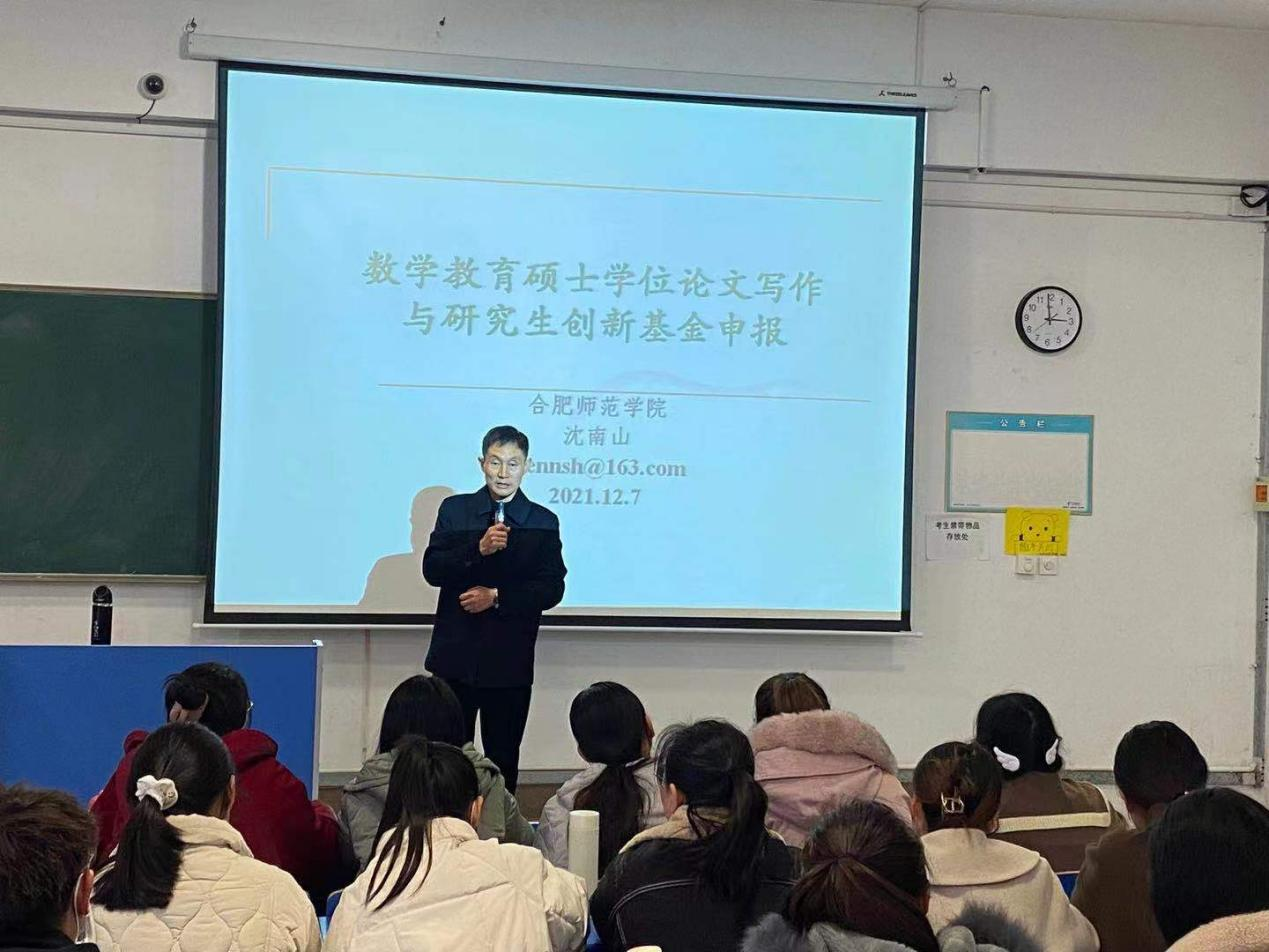 本网讯 12月7日下午,数学与统计学院沈南山教授在锦绣校区逸夫楼A109教室作了题为“数学教育硕士学位论文写作与研究生创新基金申报”的专题报告,2021级数学学科教学专业全体研究生聆听了报告。