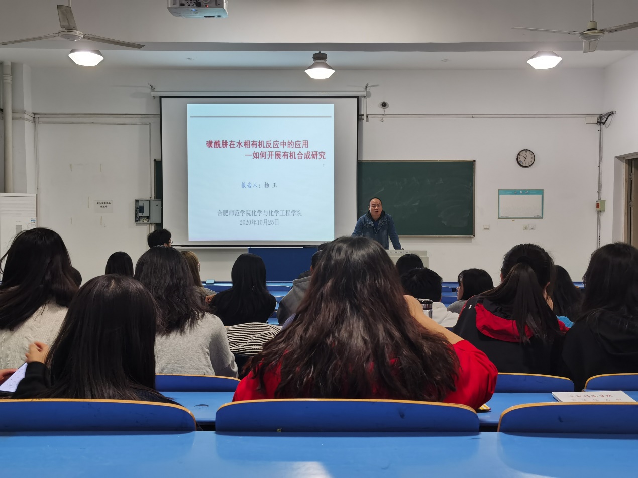 本网讯 10月25日,药物制剂教研室杨玉博士为2020级制药工程、药物制剂全体学生做专题为“磺酰肼在水相有机反应中的应用”的学术报告,报告由药物制剂陈虎副教授主持。