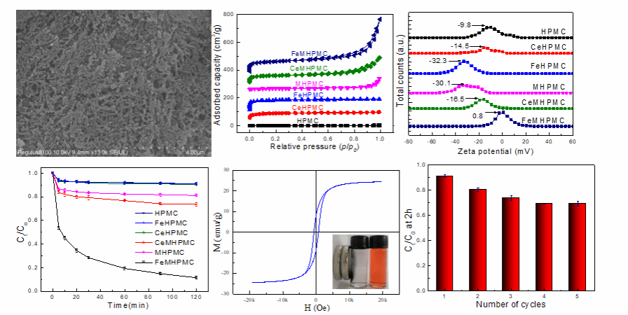 为此,课题组借助三聚氰胺辅助热解法,设计合成了磁性介孔金属/ N掺杂碳复合材料。该磁性复合材料具有由1D纳米结构相互交错组成的三维多级介孔结构。它的碳氮表面带正电,并形成缺电子共轭结构,能作为电子受体。能通过静电和π-π相互作用的多重吸附机制来实现染料废水的吸附移除。因此,该磁性复合材料具有优异的染料吸附能力,同时,还能利用其磁性将复合材料从废水中快速分离。