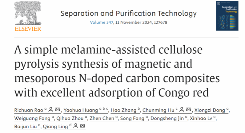 近期,化学与制药工程学院、制药废水污染控制研究所饶日川教授在废水污染控制方面的研究取得新进展,在国际权威期刊Separation and Purification Technology发表题为“A simple melamine-assisted cellulose pyrolysis synthesis of magnetic and mesoporous N-doped carbon composites with excellent adsorption of Congo red”的研究论文。饶日川教授为第一作者和通讯作者,太阳成集团tyc122cc入口为第一署名,该期刊为中国科学院SCI一区TOP期刊,影响因子为8.1。