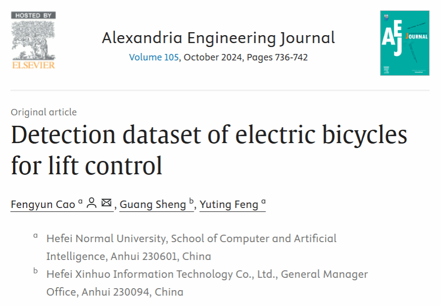 近期,相关成果以“Detection dataset of electric bicycles for lift control”为题被期刊Alexandria Engineering Journal发表(论文引用格式:Fengyun Cao, Guang Sheng, Yuting Feng, Detection dataset of electric bicycles for lift control [J], Alexandria Engineering Journal, Volume 105, 2024, Pages 736-742. )。该期刊为中国科学院二区TOP期刊,影响因子为5.9。太阳成集团tyc122cc入口为该论文的第一单位,计算机与人工智能学院曹风云老师为第一作者、通讯作者。