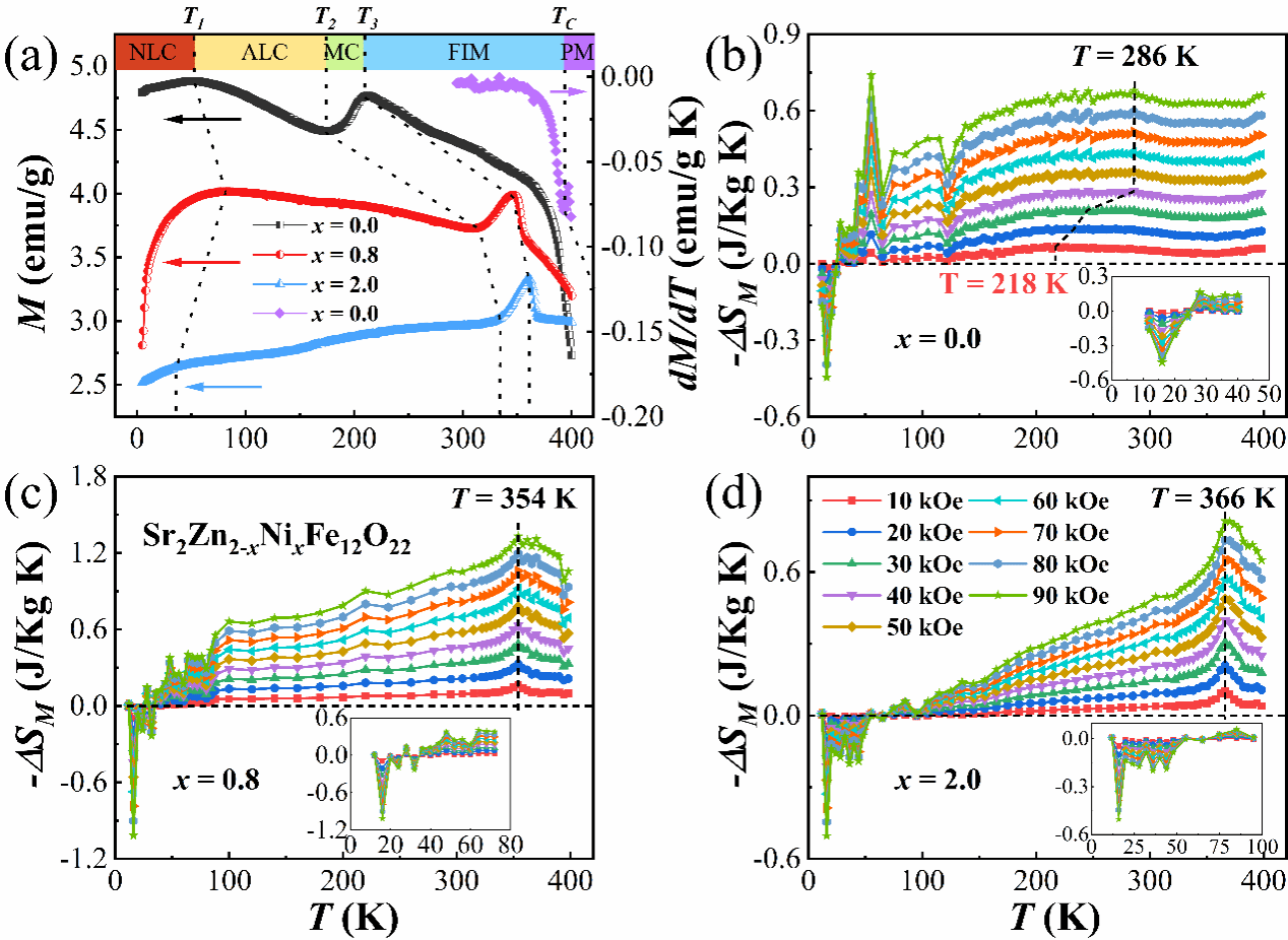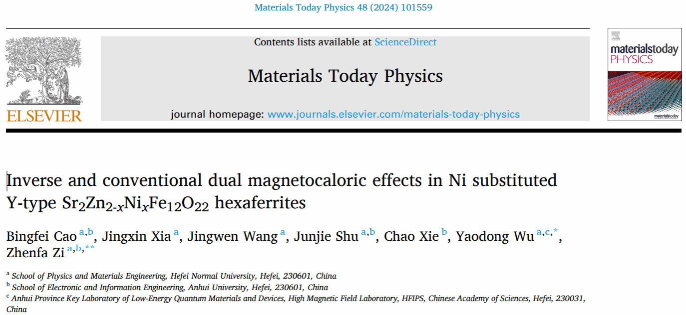 近日,由我校物理与材料工程学院与安徽大学联合培养的硕士研究生曹冰菲同学与物材学院本科生夏敬鑫、王璟雯组成的学生科研团队,针对Y型六角铁氧体的磁热效应与磁制冷性能开展研究并取得重大进展,相关成果发表在《Materials Today Physics》(中科院一区,IF = 10.0),论文题目为“Inverse and conventional dual magnetocaloric effects in Ni substituted Y-type Sr2Zn2-xNixFe12O22 hexaferrites”。曹冰菲同学为本论文的第一作者,物理与材料工程学院新能源材料与器件专业的吴耀东、訾振发老师为本论文的共同通讯作者,太阳成集团tyc122cc入口物理与材料工程学院为唯一通讯单位。