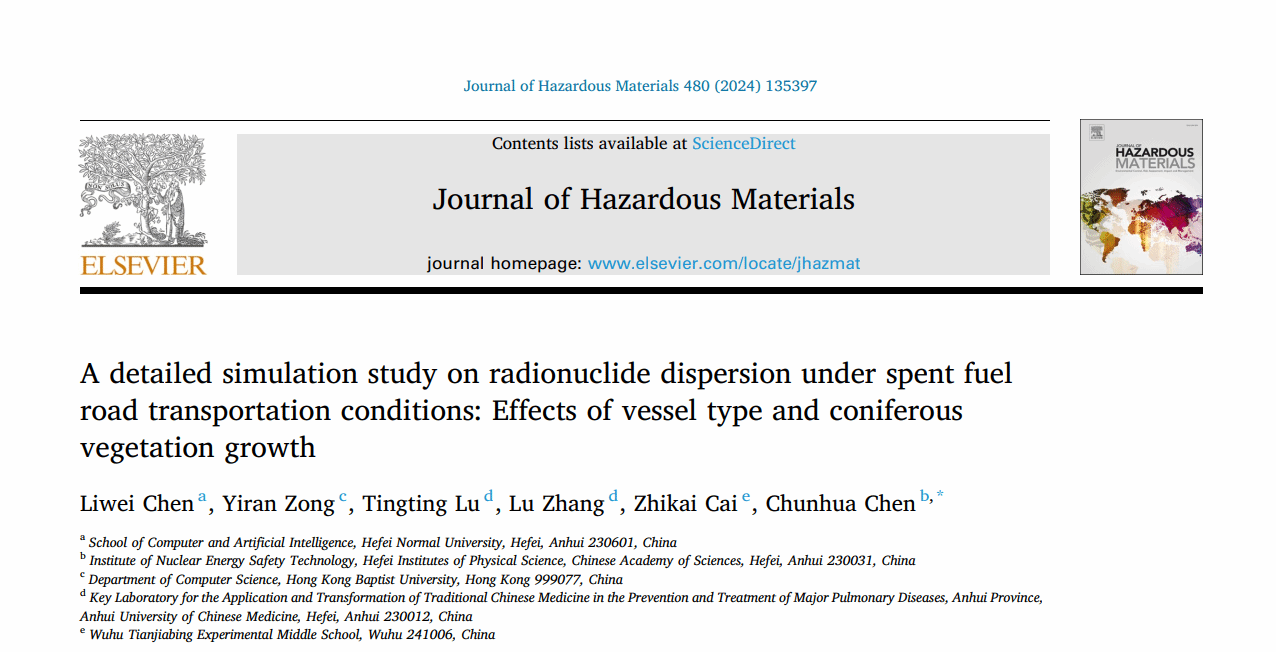 近期,相关成果以“A detailed simulation study on radionuclide dispersion under spent fuel road transportation conditions: Effects of vessel type and coniferous vegetation growth”为题发表在《Journal of Hazardous Materials》期刊。该期刊为中国科学院一区TOP期刊,影响因子为12.2。太阳成集团tyc122cc入口为该论文的第一单位,安徽省智能安检技术工程研究中心、计算机与人工智能学院陈黎伟老师为第一作者。