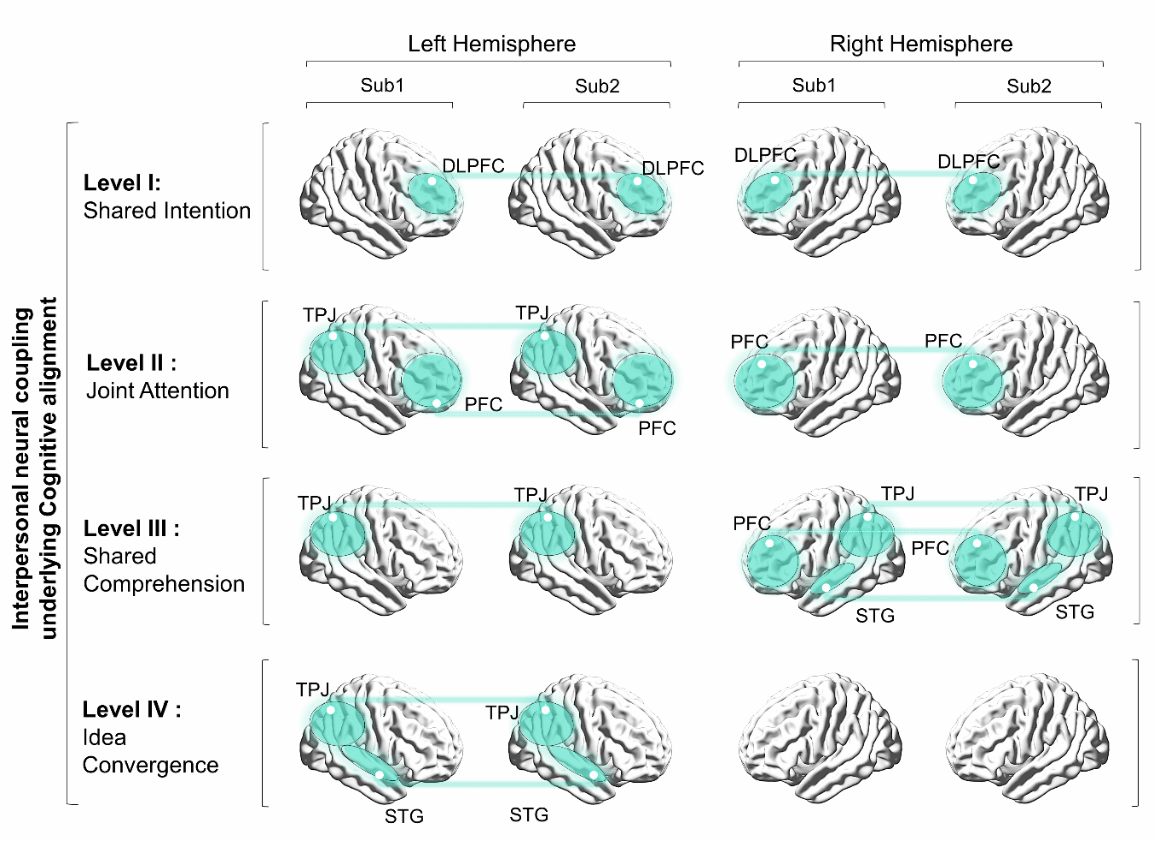 子模型2:认知对齐系统的脑际神经耦合模型(见图3)认为,认知对齐系统的不同层次涉及特定脑区的脑际神经耦合模式,主要涉及背外侧前额叶皮层(DLPFC)、前额叶皮层(PFC)、颞上回(STG)、颞顶联合区(TPJ)等区域。