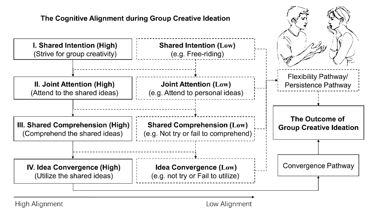 团体创新的脑际神经耦合理论模型(见图1)指出,有三个相互关联的脑际神经耦合系统共同支撑团体创新活动,即认知对齐、情感对齐和躯体对齐系统。其中,认知对齐是核心,涵盖共享意图、共同注意、共享理解和观念聚合等多个层次(见图2,子模型1),每个层次都与特定的脑际神经耦合相关联(见图3,子模型2)。该理论近一步提出团体创新认知过程的三路径模型,强调团体成员主要通过三条认知路径(灵活路径、坚持路径、观念聚合路径)生成创新观念,这三条路径共同决定团体创新表现(见图4,子模型3)。上述认知对齐系统与团体成员在选择和执行观念生成路径的过程中相互作用。团体成员自身生成的创新观念、来自其他成员的认知刺激等因素都可能反过来作用于认知对齐系统(进而影响情感对齐和躯体对齐系统)以及对观念生成路径的决策及执行,继而影响团体创新表现。此外,个体大脑内部的神经活动、神经激素和其他生理状态也可能会影响脑际神经耦合与团体创新表现间的关联。