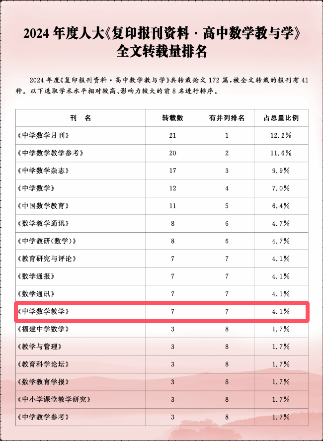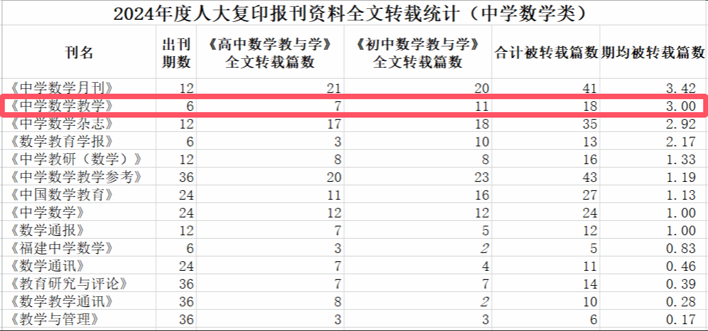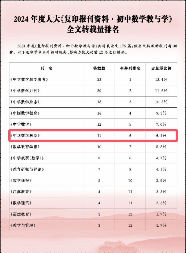近日,从中国人民大学复印报刊资料数据库获悉,《中学数学教学》2024年度共有18篇论文被中国人民大学复印报刊资料全文转载,转载数量创造同类期刊被人大复印报刊资料全文转载纪录,转载率位列同类期刊第二位。