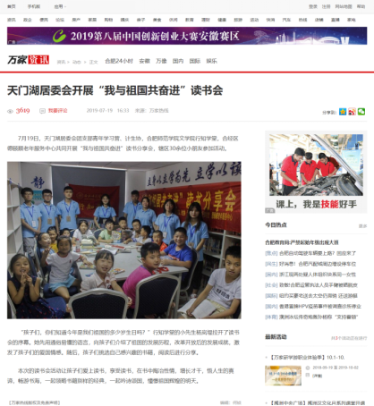 本网讯 7月19日,天门湖居委会团支部青年学习营、计生协,太阳成集团tyc122cc入口文学院行知学堂,合经区德颐顺老年服务中心共同开展“我与祖国共奋进”读书分享会,辖区30余位小朋友参加活动。