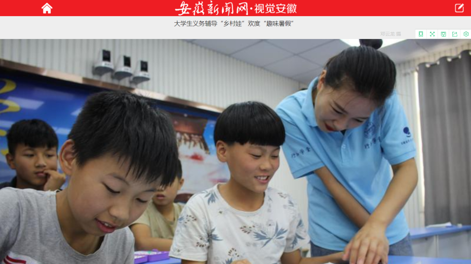 安徽日报旗下安徽新闻网“视角安徽”栏目以《大学生义务辅导“乡村娃”欢度“趣味暑假”》为题进行了大篇幅专题报道。(新闻中心)