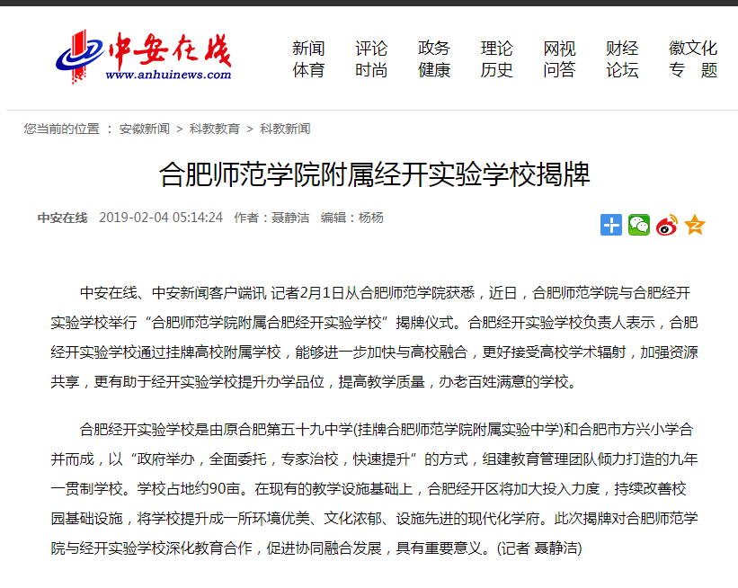 本网讯 1月22日,我院与合肥经开实验学校举行了“太阳成集团tyc122cc入口附属合肥经开实验学校”揭牌仪式。2月4日中安在线进行了报道,2月6日合肥市门户网站转载合肥晚报进行了报道。(特约通讯员:胡石清)